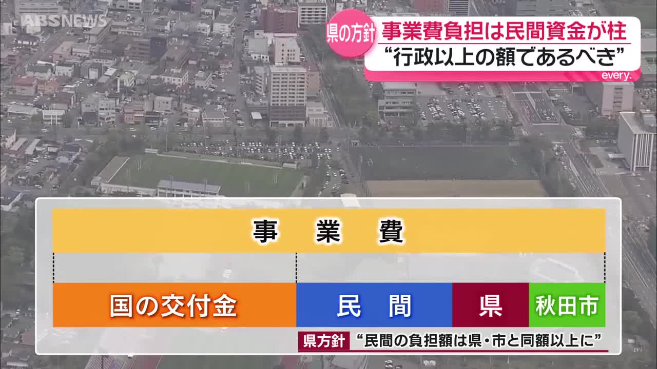 スタジアムの整備について秋田市は、市単独で事業主体にならないこと、維持管理費を負担しないことを前提条件としていて、秋田県とクラブに整備の試算とともに伝えています。
